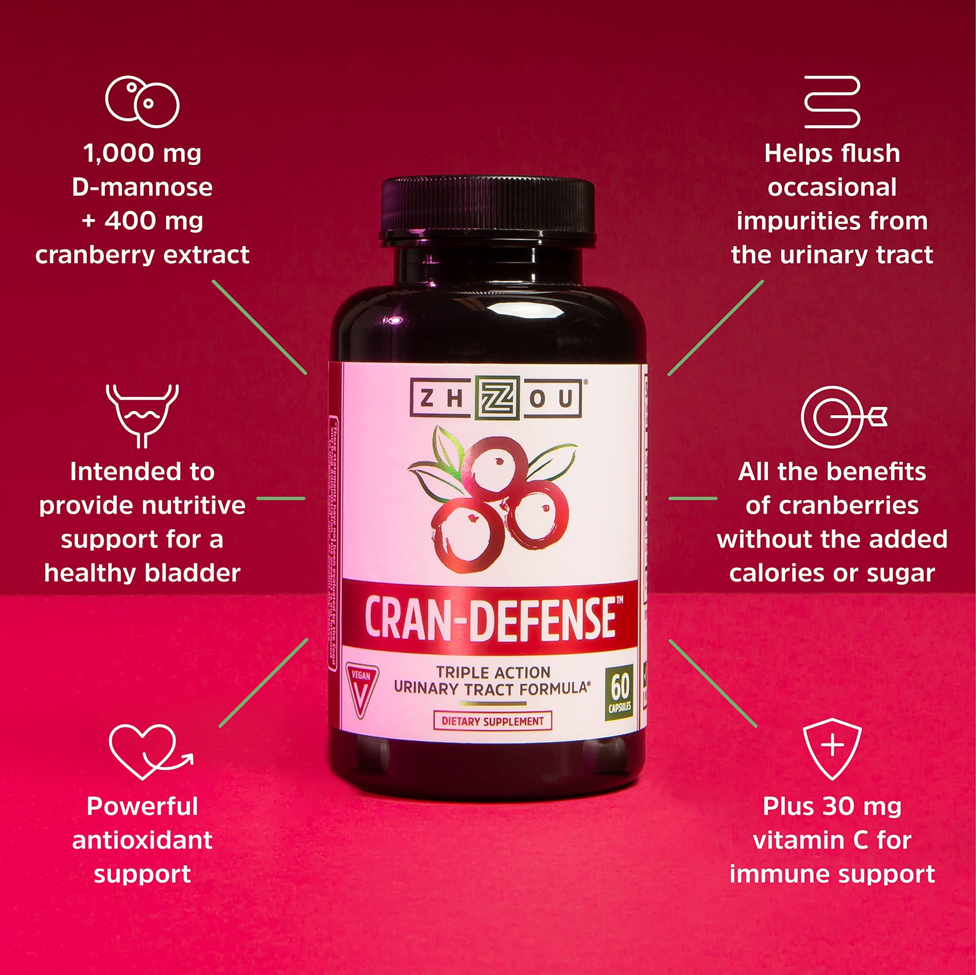 Pre-Order | Arrives in 5–10 Days – Zhou Cran-Defense - Cranberry Pills for Women & Men, D Mannose with Cranberry Extract, 1000 mg D-Mannose Per Capsule for Urinary Tract Health, Antioxidant Support - 60 Veggie Capsules