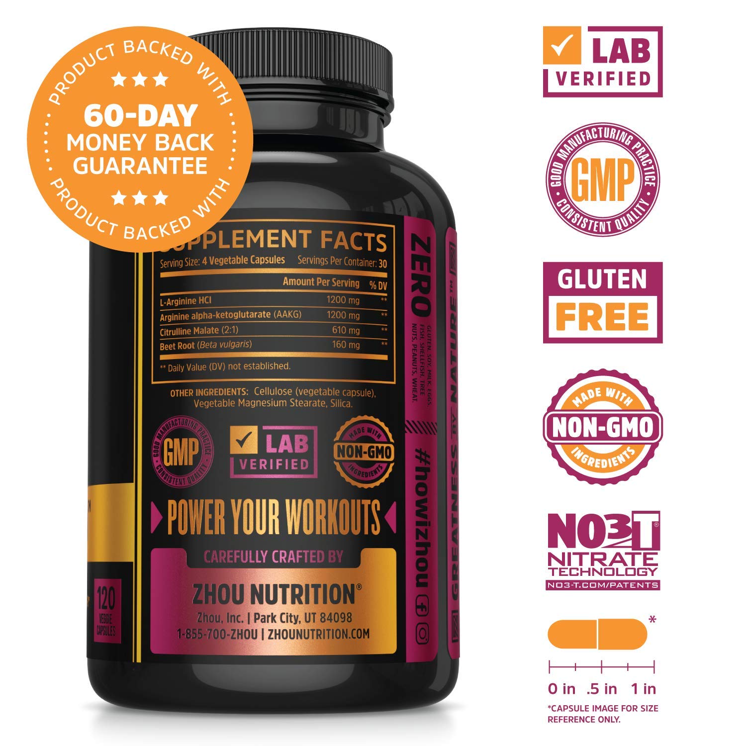Details: Zhou Nitric Oxide with L Arginine, Citrulline Malate, AAKG and Beet Root | Powerful N.O. Booster and Muscle Builder for Strength, Blood Flow and Endurance | 30 Servings, 120 Veggie Caps